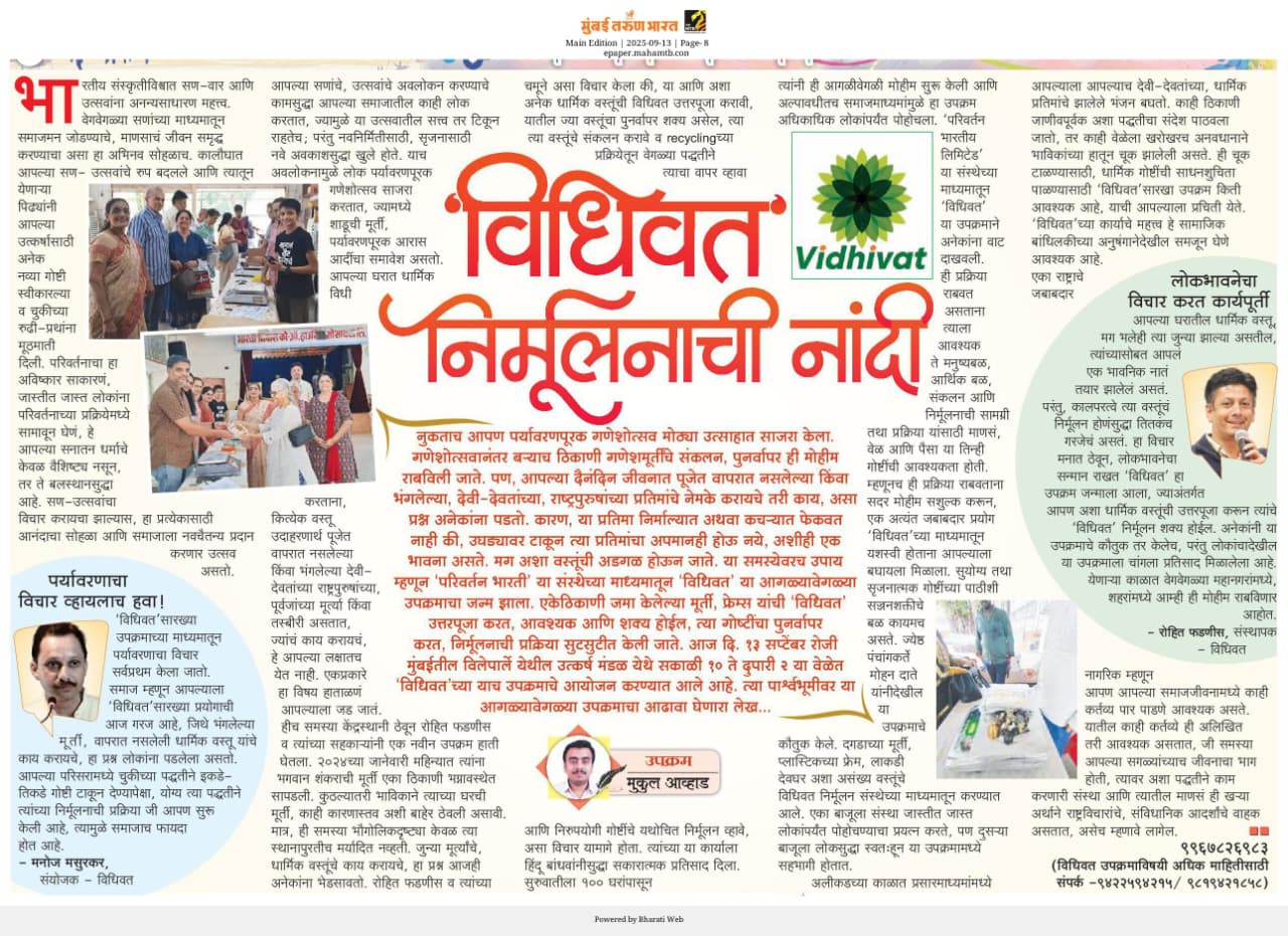 Vidhivat is a for-profit organization, and we have chosen this business model to ensure the sustainability of our initiative. We need to cover expenses such as contract labor, recycling costs, transportation, venue rents (like community halls or society club houses), donations to temples, marketing expenses, and more. Additionally, we aim to make this venture profitable.